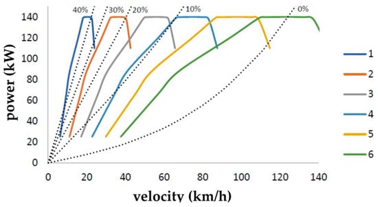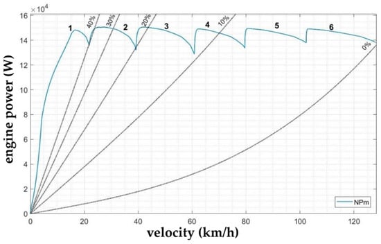 Similarly to the torque values, the power values at full fuel delivery are obtained directly from the external engine revolution characteristics overviewed in Table 2. In the equation for the determination of the vehicle speed (7), the engine revolutions corresponding to the given points of the external engine characteristics and other necessary parameters were applied. In this way, the values of the usable engine power at all gears can be obtained.