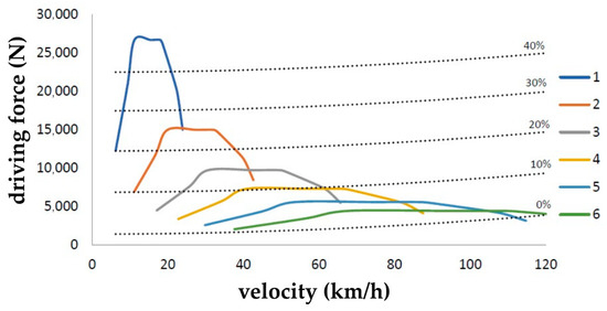 Using this relation, it is possible to find the values of traction forces on the driving wheels of the vehicle for every gear. Applying this equation, it is also possible to obtain the characteristics showing the dependence of the driving resistances considering different terrain slope angles, as can be seen in Figure 5.