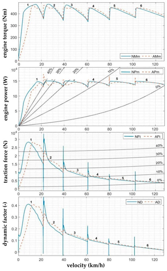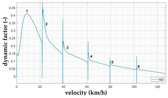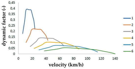 The traction force varies with the engine revolutions and, therefore, with the vehicle speed and, at the same time, with the selected gear. Similarly, air resistance varies quadratically with vehicle speed, and for this reason, it is appropriate to show the dynamic factor values graphically using the dynamic characteristics of the vehicle (Figure 6).