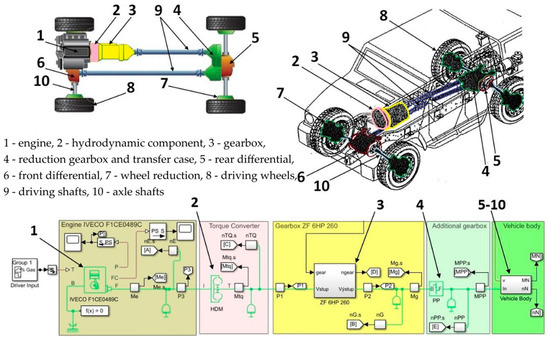 In many cases, the research is focused on the design and fabrication process of mechanical components of the drive or transmission mechanisms of vehicles [1]. Together with the research and development of drive and transmission mechanisms, it is necessary to analyze their structural and kinematic characteristics [2,3] or perform failure analysis [4]. The optimization process can be focused on the selection of the most convenient commercially available components, such as a pump, and their influence on the fuel economy [5]. However, in military applications, especially considering already used vehicles, it is a very complicated and time-consuming process to modify the mechanical construction or to replace the components of the vehicles. Therefore, our research is focused on the creation of the simulation model of the drive and transmission mechanism of the vehicle.