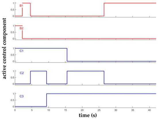 During the verification of the simulation model, it was not necessary to implement any element of automation of internal or external simulation inputs. The external simulation input in this case can be represented by the driver’s demand for power either in the form of the required fuel supply or in the form of the accelerator pedal position. For the purpose of the comparison of the values of mechanical efficiency η, driving forces F1, powers P and dynamic factors at the particular gears, the scenario of full fuel supply (T = 1) was chosen. In this case, the second external input of manual gear shifting also remained, which is achieved by the activation or deactivation of the related gearbox control components (B1, B2, C1, C2 and C3) at an adequate time (Figure 8).