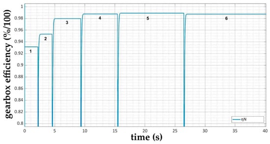 From the power characteristics at the particular gears shown in Figure 9, it can be seen that mechanical losses occur in the gearbox model. The calculated values of the mechanical efficiency of the ZF 6HP 260 gearbox at the particular gears can be seen in Figure 10.