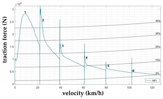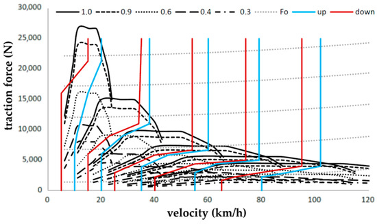 Traction characteristics graphically represent the balance of forces acting on the vehicle in the direction of its movement. It shows the dependence of the driving forces and driving resistances on the vehicle speed. Traction characteristics are therefore a graphical solution of Equation (6), which can be modified into the form (10):