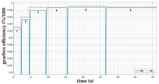 Thanks to the created complex model, it is possible to analyze not only the torques and revolutions but also the significant number of other outputs, for example, power, efficiency, fuel consumption, inertia or traction characteristics. As the efficiency is the most complex parameter of the ZF 6HP 260 gearbox, which was also obtained analytically, this part of the research was focused on the comparison of the gearbox efficiency at individual gears, obtained using the numerical and analytical method.