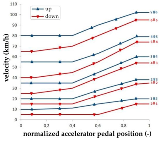 After the comparison of the mechanical efficiency values of the gearbox achieved using analytical and numerical methods, it was proven that the deviations between them did not exceed 1%. Therefore, it was possible to analyze the values of the parameters characterizing the dynamic properties of the vehicle. Considering significant simplifications applied in analytical calculations and different conditions, the deviations between the values and characteristics obtained analytically and numerically are negligible. Our research proved that the complex model of the vehicle’s drive and transmission mechanism created in Matlab software can be effectively applied for the simulation of the behavior of the drive and transmission mechanisms of wheeled truck vehicles. Consequently, the process of the gearbox shifting automatization, with an emphasis on gearshift map creation, was presented. The data acquisition process necessary for the gearshift map creation together with the gearshift control logic was also described.