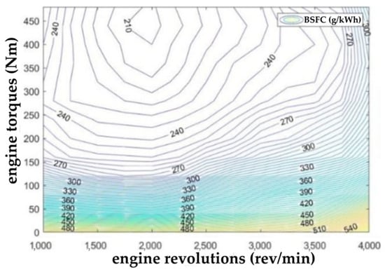 After converting vectors from the general engine block of the Simscape module environment to the common Matlab workspace, it is possible to visualize the BSFC model in the form of a contour plot, as it can be seen in Figure 25.