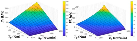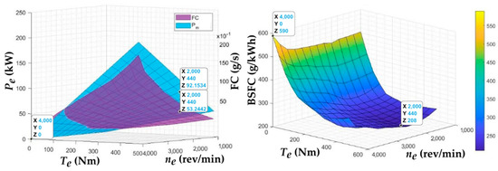 Subsequently, it was possible to create a dependence of the effective engine power Pe and fuel mass flow rate FC on the engine revolutions and torque values. The obtained characteristics are shown in Figure 26.