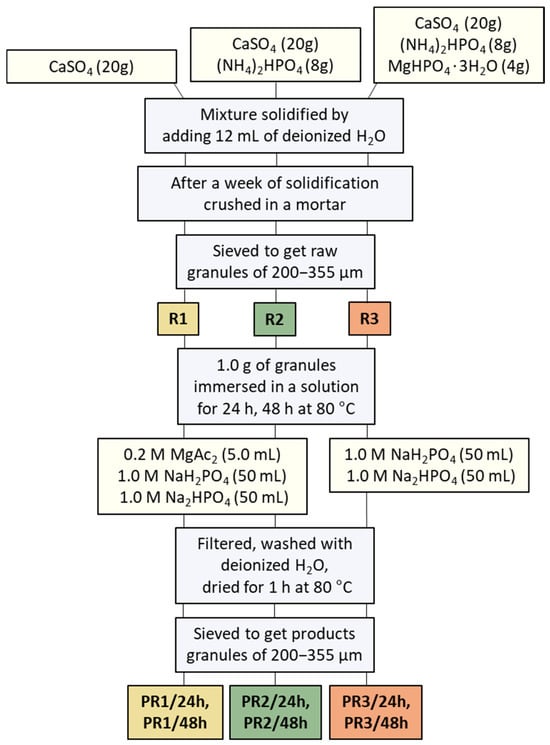 Mg-WH granules were synthesized through a dissolution–precipitation reaction, as illustrated schematically in Figure 1. Calcium sulfate (CS, CaSO4) was selected as the starting material, which was prepared by heating CSD powder at 170 °C for 5 h. Initially, three types of precursor granules with different chemical compositions were synthesized: monophasic (R1) and mixed (R2, and R3) granules. Monophasic precursor granules R1 were prepared by thoroughly mixing 20.0 g of CS with 12 mL of deionized water. Mixed granules R2 were prepared by homogenizing 20.0 g of CS with 8.0 g of (NH4)2HPO4, and then mixing with 12 mL of deionized water. Mixed granules R3 were prepared by homogenizing 20.0 g of CS with 8.0 g of (NH4)2HPO4 and 4.0 g of MgHPO4·3H2O, then mixing with 12 mL of deionized water. The R1–R3 samples were kept at room temperature for a week to allow the solidification process to occur. Then, solidified samples were crushed in an agate mortar and sieved to obtain granules with a size of approximately 200–355 µm.