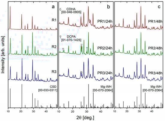XRD patterns of R1–R3 (a), PR1/24h–PR3/24h (b), and PR1/48h–PR3/48h (c) granules synthesized via a dissolution–precipitation reaction.