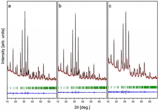 In order to ascertain the structural parameters of the synthesized single-phase PR1/48h–PR3/48h samples, a Le Bail refinement of the XRD data was conducted. The XRD patterns, together with the fitting curves derived from the Le Bail refinement, are displayed in Figure 3. The Le Bail refinement plots demonstrate an excellent correlation between the observed XRD patterns (red circles) and the calculated patterns (black lines), which correspond to the allowed Bragg reflections (green ticks), while the discrepancy between the experimental and refined data is shown by the blue line. This confirms the successful formation of the Mg-WH phase with a rhombohedral structure and space group R3c. The structural parameters of the Mg-WH phase synthesized from various starting compositions of raw granules during the 48 h synthesis process are presented in Table 1. The resulting products exhibited consistent structural characteristics, both within the set of samples and when compared to previously published data [24].