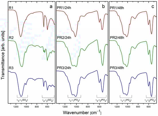 FTIR spectra of R1–R3 (a), PR1/24h–PR3/24h (b), and PR1/48h–PR3/48h (c) granules synthesized via a dissolution–precipitation reaction.