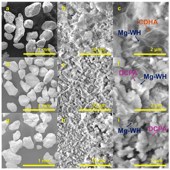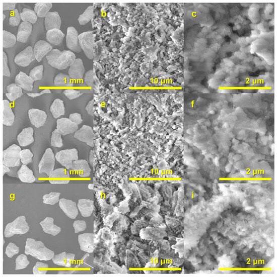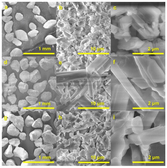 SEM images of PR1/48h (a–c), PR2/48h (d–f), and PR3/48h (g–i) granules synthesized via a dissolution–precipitation reaction.