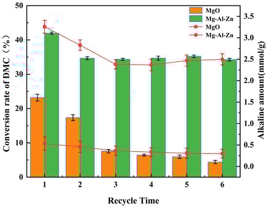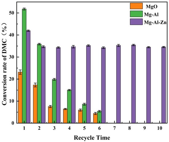 Catalytic performance and durability of the catalysts (reaction conditions: DMC/C2H5OH = 1, catalyst dosage: 3.0 wt.%, reaction temperature = 78 °C, reaction time: 3 h). Since the conversion rate of DMC dropped below 6.00% after the sixth use of MgO and Mg-Al as catalysts, there was no need to continue the repeated experiments. The experiment was repeated three times for each data point. The error bar is the error range of the data point obtained based on the calculated standard deviation, and the upper and lower horizontal lines represent the upper and lower limits of the 95% confidence interval of the mean.