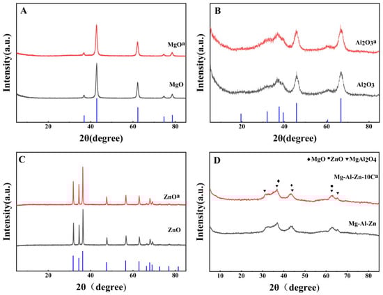 XRD patterns of the catalysts before and after use for MgO (A), Al2O3 (B), ZnO (C), and Mg-Al-Zn (D). (a: after used, 10Ca: the catalyst after 10 cycles) (test conditions: a 2θ range of 5–85° and a scanning rate of 10°/min). The blue lines represent the standard cards of the crystal images corresponding to each oxide.