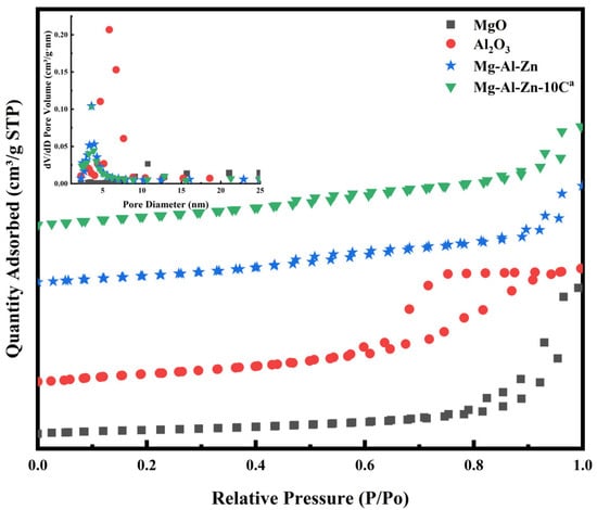 The N2 adsorption- desorption isotherms of MgO, Al2O3, Mg-Al-Zn catalysts, and the Mg-Al-Zn catalyst after use are shown in Figure 4, and their structural properties are listed in Table 2. Based on the data in the table, it can be concluded that the pore size distribution of MgO is concentrated around 9–13 nm, while that of Al2O3 is around 4–8 nm. The pore size distribution of the Mg-Al-Zn catalyst is entirely concentrated around 2–5 nm. Compared with the BET characterization of Mg-Al-Zn composite oxides in other literature [], the specific surface area of the Mg-Al-Zn catalyst in this paper is relatively slightly larger, but the average pore size of this catalyst is smaller. Moreover, the specific surface area and pore size of the catalyst after 10 cycles of use show little difference compared to the unused catalyst, indicating that the pores of the catalyst are not blocked. This indicates that the decrease in the activity of Mg-Al-Zn during the first two uses has no direct relationship with the pore structure and specific surface area of the catalyst.