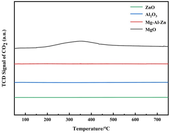 According to the CO2-TPD results shown in Figure 5, it can be inferred that MgO has a weak desorption peak at 250–450 °C. Its alkali strength is stronger than that of MgO obtained under other preparation conditions [], but the number of alkali sites is relatively small. However, the alkaline strength of ZnO, Al2O3, and Mg-Al-Zn catalysts is relatively weak. Under the test conditions of CO2-TPD, no desorption peak occurred, indicating that there was no adsorption or the amount of adsorbed CO2 was extremely small. This shows that the catalyst was less affected by CO2 []. Therefore, in order to determine the CO2 adsorption and desorption on the solid surface of the catalyst more accurately, the DRIFTS method was employed to characterize the adsorption and desorption process.