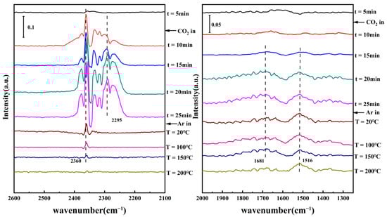DRIFTS of Mg-Al-Zn catalyst of CO2 adsorption followed by Ar sweeping. (Approximately 20–30 mg of catalyst is loaded into the in situ cell). The samples are first pretreated in an Ar atmosphere at 400 °C for 1 h. Then, the samples are slowly cooled to 20 °C while sweeping with Ar gas, and the background spectra are recorded. After a 10 min purge with Ar gas, CO2 gas is introduced. After 20 min of CO2 adsorption, the Ar is purged from the cell, and after 5 min of blowing, the cell is heated to 400 °C at 10 °C/min.