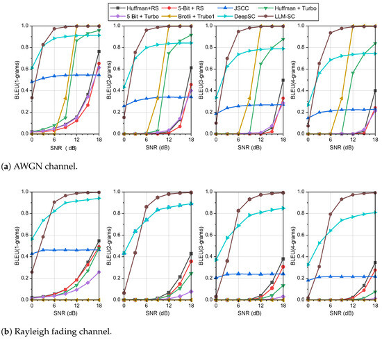 Figure 2b shows the performance of LLM-SC under Rayleigh fading channels. Traditional encoding and decoding schemes experience significant performance degradation in Rayleigh channels, with the highest BLEU score not exceeding 0.6 at an SNR of 18 dB. In contrast, DeepSC shows better adaptability to Rayleigh fading channels, indicating that neural network-based semantic encoding and decoding systems can effectively learn channel characteristics. However, DeepSC still fails to achieve error-free transmission, even when BLEU scores are high. The LLM-SC model demonstrates performance under Rayleigh fading channels similar to that in AWGN channels, with no noticeable degradation, consistent with the conclusion of Equation (10). Furthermore, LLM-SC achieves error-free transmission at high-SNR levels and outperforms all compared models. When comparing multiple n-gram scores, the advantage of LLM-SC over other methods heightens with higher n-grams at high-SNR levels.