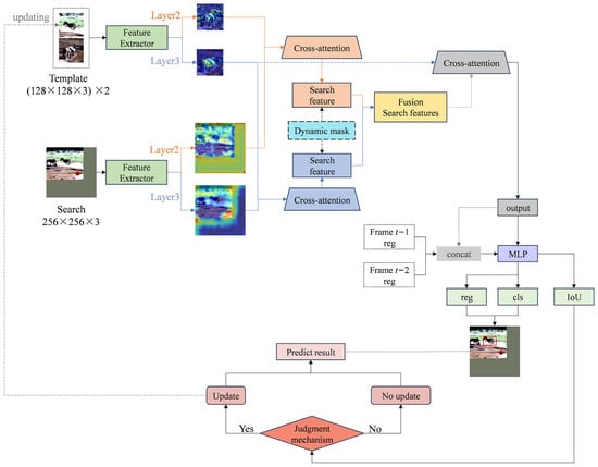 When objects with the same appearance and texture frequently appear around an object, the predicted bounding boxes are easily transferred to similar objects. In the long-term tracking process, the model may fail to accurately locate the true object, eventually deviating from it. To address the issues of insufficient feature representation and error accumulation in TransT, this paper proposes a model that focuses explicitly on the object itself, thereby effectively distinguishing the object from similar entities in the background. Since cross-attention can enhance focus on key regions by leveraging the interrelations between different images and suppress irrelevant background information, and the mask mechanism can further filter critical regions and eliminate redundant features, this work introduces an object semantic enhancement model to ensure that the algorithm concentrates on the object, reducing background interference. Furthermore, to improve the model’s adaptability to variations in object appearance and spatial position, the object template update mechanism guided by the judgment conditions [] is adopted. This enhances tracking accuracy and stability in complex scenes with background distractions, providing a more robust solution for object tracking tasks. The overall tracking framework of the algorithm proposed in this paper is shown in Figure 1.