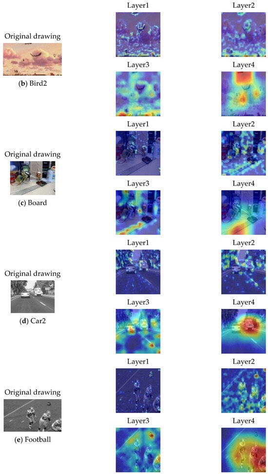 The feature vectors used by TransT are extracted from the ResNet50 [] backbone network. ResNet50 is a variant of the deep Residual Network, with a structure of 50 layers, used to solve the degradation problem in deep convolutional neural networks (CNNs), where the training set error increases as the network depth increases. The main hierarchical structure of ResNet50 is [Layer1, Layer2, Layer3, Layer4]. Through the progressive deepening from preliminary features to advanced features, it provides rich and hierarchical feature representations for the model. Due to their different levels of abstraction, features at different levels can have different application values for tracking tasks. Low-level features capture fine-grained details, whereas high-level features convey more abstract and semantic information. This hierarchical feature representation improves the model’s ability to adapt to external variations in the object, such as changes in lighting, occlusion, and fast motion. At the same time, it also improves the robustness of the model in different scenarios and background conditions.