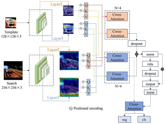 There has always been an inherent correlation between template images and search images, which can be explicitly learned through cross-attention to improve object recognition ability. ResNet50 is used to extract the second and third layer features of template image and search image and obtain template features [Layer2: ; Layer3: ] and search features [Layer2: ; Layer3: ], where C, H, and W represent the number of channels, height, and width of the feature map, respectively, and and . Z represents a template image, and X represents a search image.