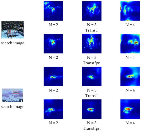 As shown in Figure 4, when N = 4, the model is able to effectively synthesize attention information from multiple levels and boost its feature representation capability. Moreover, it is evident that the results of TransT are rather dispersed, lacking sufficient focus on the object itself. The model’s grasp of the object’s state is not detailed enough, and the distribution of influence values is more susceptible to background factors. The results of Transfpn are more accurate in both positioning and object range locking. More importantly, it can concretize the actual shape of the object, which has a great promoting effect on distinguishing between objects and similar objects. Therefore, the model can improve judgment accuracy in the tracking process through this learning.