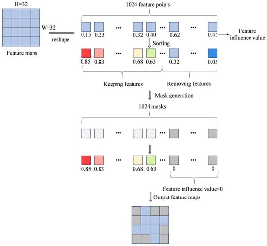 We label the mask of the retained feature point with and the mask of the removed feature point with . During calculation, the feature influence value of the feature points whose mask is equal to 0 is 0, and the feature influence value of the feature points whose mask is equal to 1 is unchanged. The feature influence value of each feature point after applying the mask is calculated as shown in Equation (9).