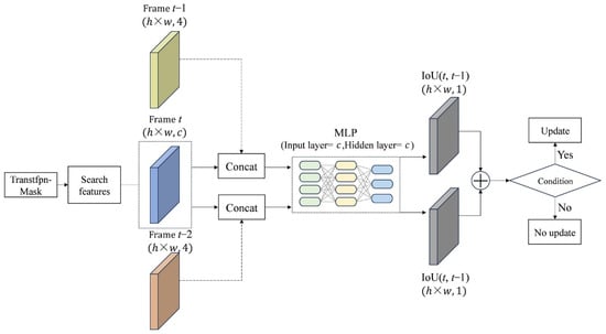 During the tracking process, the object’s appearance and posture may change, and it can also be influenced by external factors. If the template is not updated in a timely manner, the tracking model may fail because it cannot adapt to the object’s new appearance. Common template updating methods include updating templates periodically according to preset time intervals or frame numbers and large-scale time sequence information modeling methods that predict the future state by learning the dynamic change in the object with rich context information. However, the former may have the problem of low template image quality, while the latter is high in computing cost. In practical application, both the real-time functionality and accuracy of tracking should be considered. Therefore, this paper uses the object template update mechanism guided by the judgment conditions [] proposed before to start the template update mechanism under specific conditions to achieve the timely and accurate updating of the object template. Specifically, Transtfpn-Mask is taken as the baseline, and the trained IoU prediction module is combined to judge the tracking results, and the combined model is named Transtfpn-T. The IoU prediction module leverages the outcomes of classification and regression to estimate the IoU value in the current frame. By gauging the correlation between the current frame and the prior two frames, it decides whether an update to the object template is warranted. The detailed template update model is illustrated in Figure 6.