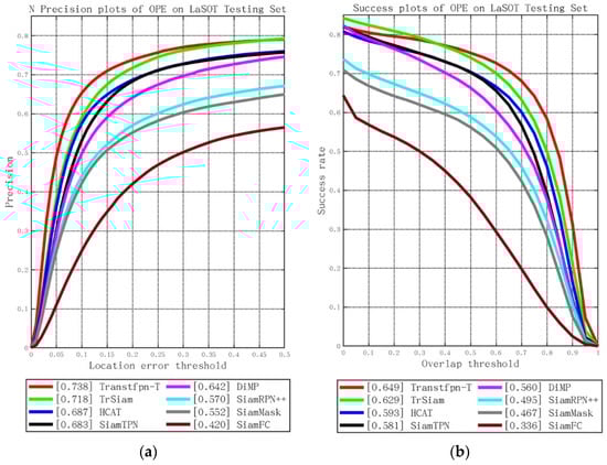 Graph comparing the results of the algorithms involved in this paper with other algorithms on the LaSOT dataset. (a) Norm precision; (b) success rate value.