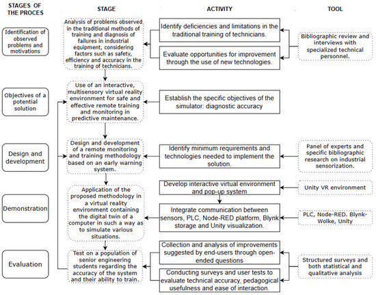 This research addresses and proposes the integration of virtual reality technologies and real-time sensing for the development of a collaborative, safe and interactive environment, which also allows the ability to remotely monitor equipment along with providing an environment that allows for training against maintenance tasks. For the development of this project, it was decided to use the Design Science Research Methodology (DSRM) since it is widely accepted in technological and industrial development contexts and structures research in a systematic way. Figure 1 shows the activities necessary to carry out this research, together with the tools and methodologies that allow its direct implementation.