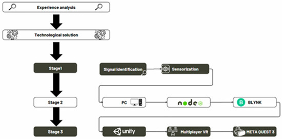 The development of the digital twin with VR involves the integration of multiple advanced technologies. First, 3D scanning techniques are used to obtain an accurate representation of the equipment, ensuring that the virtual geometry accurately matches the actual dimensions. Next, graphics engines, such as Unity, are used to generate an immersive and interactive environment that enhances the operator’s experience. Finally, the connection with software such as Node-RED and Blynk allows users to establish efficient and continuous communication between the physical sensors and the digital environment, facilitating the accurate and seamless synchronization of sensory information in real time [13].