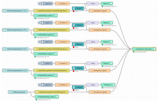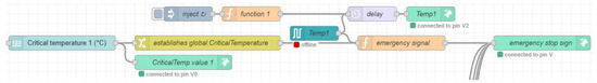Figure 6 presents a diagram of the structure whose function was to define and restrict the critical value of a parameter. Then, the next structure, which operates in parallel and is represented in Figure 7, oversees injecting data in such a way that it fluctuates and allows the desired simulation; it directly communicates the sensor data with the server in Blynk and its respective representation in Unity. Finally, the structure shown in Figure 8 receives data from both previous structures and interprets the values to send a warning signal to the simulation in Unity when a parameter reaches its critical value. This allows the freezing of the simulation, preserving the last data received, while feeding the pop-up system in Unity.