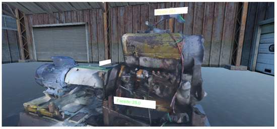 To enhance the understanding of the proposed system, Figure 11 and Figure 12 present visual examples of the Unity-based application. These screenshots illustrate the immersive environment where users can monitor real-time sensor data directly within the digital twin. Key features such as the color-coded parameter indicators and pop-up alert system are visible, demonstrating how the simulation provides intuitive feedback for maintenance training and early fault detection.