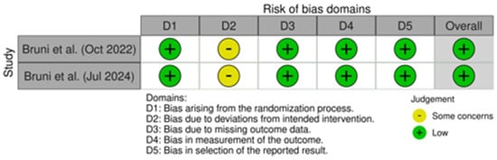 The risk of bias of the two randomized controlled trials [1,2] was evaluated using RoB 2 (Figure 3), a revised Cochrane risk-of-bias tool for randomized trials [40].