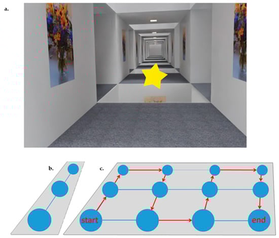 A second purpose was to determine the relationship between the fidelity of cognitive maps and the number of environmental objects present. Distinctive objects, often called “landmarks”, facilitate internal representations of space since they serve as reference points for nearby locations [18] and for structuring the environment [19]. However, a larger number of objects might degrade those representations by elevating the cognitive load: more object–location bindings must be maintained in spatial memory, straining capacity and increasing the risk of interference. Indeed, the extant literature on human working memory documents that a larger number of items is more difficult to remember [20,21]. This “set-size effect” has also been documented in a wayfinding study [22]. Notably, however, participants in the latter study were asked to repeatedly follow a fixed route, a task that requires serial-order memory and associative memory [23] but not the use of a cognitive map. Whether there exists a set-size effect for cognitive maps, therefore, is still unknown and is investigated in this study by comparing participants’ performance in two environments containing a different number of objects.