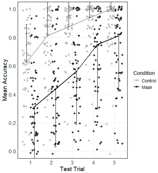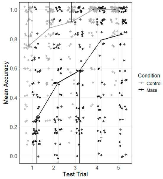 Table 1 summarizes the outcome of the logistic regression of Experiment 1. The backward elimination procedure reinstated only the main effects of the Condition and Test: response correctness increased from one test to the next, and was consistently higher under the Control compared to the Maze condition (cf. Figure 2). The across-participant difference between conditions (mean ± standard deviation) was 0.26 ± 0.25, and the correlation between condition means was r = 0.53 (p < 0.001), indicating a large effect size. This suggests that the Maze condition posed a greater challenge, but both conditions tapped into overlapping cognitive resources. Notably, backward elimination removed all terms that included boundary effects.