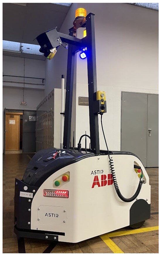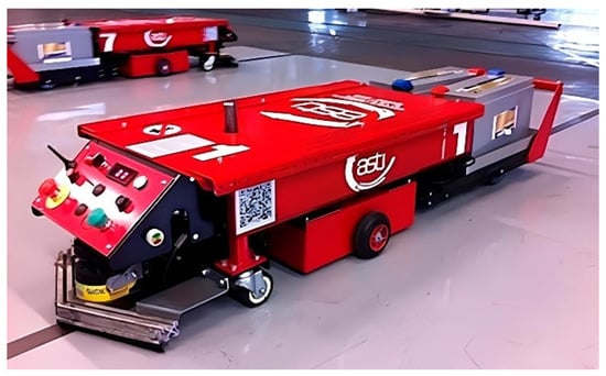 Three mobile robots were considered for the development of the fleet management system, consisting of two AMRs and one AGV, from different brands. For this case study, the AGV used is an ASTI TriBot (with specifications listed in Table 1), as shown in Figure 3. Developed by ABB, it is designed for industrial and logistical applications. The AGV is characterized by its flexibility and navigation capabilities, making it ideal for material transport tasks within factories and warehouses [].