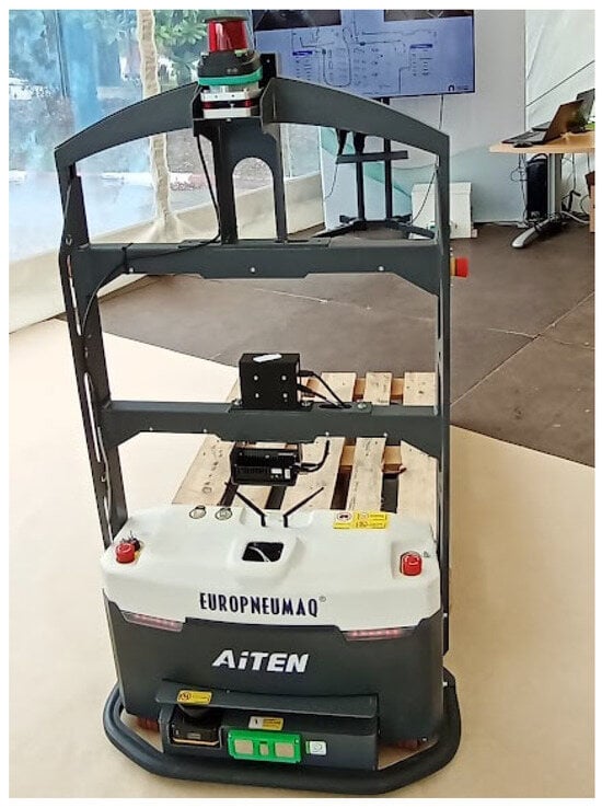Regarding the AMRs, one of them is an Aiten MP10 (with the specifications listed in Table 2), as shown in Figure 4. The Aiten MP10 is a forklift robot from the MP series by AiTEN Robotics, designed to optimize material handling in industrial environments. This model stands out due to its compact and modular design, integrating a differential wheel system and a forklift chassis with AiTEN’s advanced Simultaneous Localization and Mapping (SLAM) laser navigation technology [].
