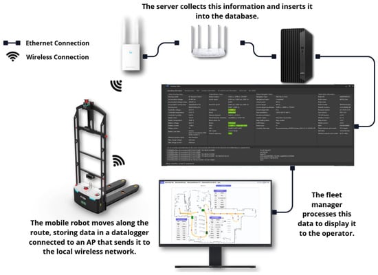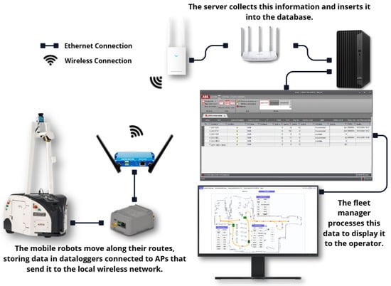 For the AGV ABB TriBot, this process is carried out through a datalogger that records real-time information about the vehicle’s state and position. To ensure a stable connection during the development phase, the AGV was initially connected to a computer via Ethernet, configuring the computer’s IP address to match the robot’s address range. Access to the data is made through a web page of the datalogger, where information such as the position, system status, and recorded events can be viewed. However, for more efficient communication, the datalogger is connected to a router, allowing remote data collection without the need for a direct physical connection, as shown in Figure 6.
