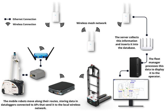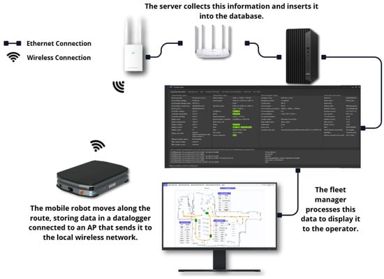 One of the main goals of Industry 4.0 is the automation of production and distribution lines, aiming to enhance flexibility and optimize manufacturing processes. Achieving this objective requires the integration of technological solutions that align with these goals. One such approach is the deployment of mobile robots to distribute materials and tools within factories []. Thanks to their high level of autonomy and adaptability, the use of mobile robots is pervasive in different industries, supporting production systems and warehouse logistics []. Thus, mobile robots have become increasingly important in smart factories due to their viability, high precision, and efficiency in industrial applications. As a result, fleet and mobile robot management becomes a key factor in the performance of industrial processes, positioning fleet management systems as critical and valuable assets [].