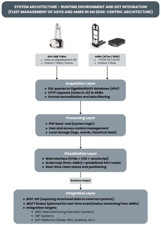 Figure 10 presents the architecture of the fleet management system runtime environment, highlighting its modular structure and its capacity for integration with the Industrial Internet of Things (IIoT). Although the communication with IIoT systems is not yet active in the current implementation, the architecture was designed to allow for this expansion in a seamless manner. The lower layer of the diagram represents this future capability, including two main mechanisms: a REST API, which exposes structured data (such as robot positions, statuses, and events) to systems like MES and ERP, and an MQTT broker, intended to enable real-time event publishing from the AMRs. This approach ensures compatibility with IIoT platforms such as Node-RED, Grafana, and other industrial solutions. Additionally, the architecture has been designed to support the future integration with the VDA 5050 protocol, promoting interoperability with fleet control systems from multiple manufacturers in a standardized production environment, in line with the principles of Industry 4.0.
