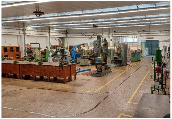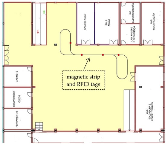 The tests involving the AGV and AMRs were conducted in the Mechanical Engineering Department of the Coimbra Institute of Engineering, within a laboratory covering an area of approximately 500 m2, which has machines and furniture of different sizes and with different forms of organization, as well as some wide movement corridors. Figure 10 shows the laboratory in question, where it is possible to see the circuit created with the magnetic strip to move the AGV. This space is the most suitable for carrying out experimental tests, as it roughly simulates the conditions found in the factory where the final prototype is to be installed.
