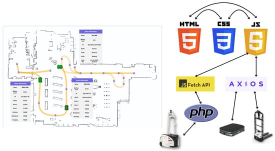 For the communication between JavaScript and PHP, the FetchAPI was used, a native JavaScript interface that allows asynchronous HTTP requests. This API acts as an intermediary between the client-side code JS and the server-side code (PHP). Through the API, it is possible to send data to PHP scripts, which can then query, add, or remove information from the AGV databases or the fleet manager’s access control database. All of this is achieved dynamically without the need to reload the web page.