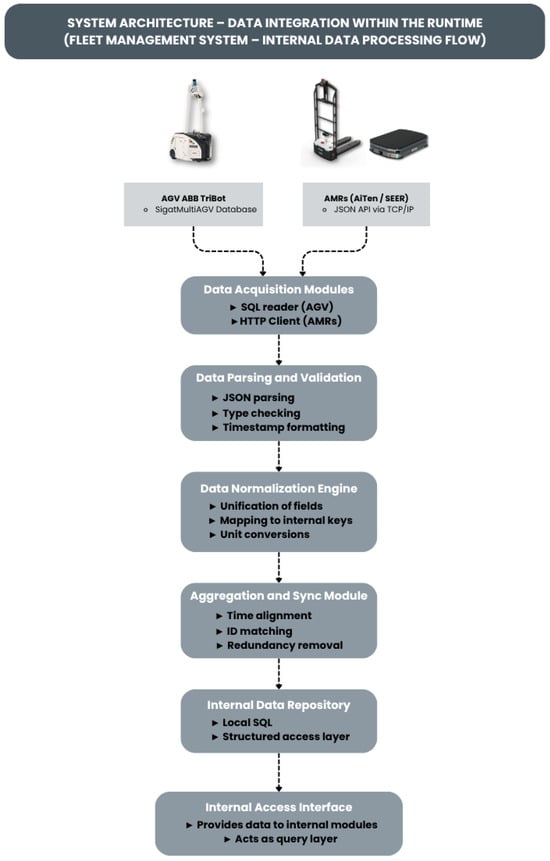 Figure 17 presents the internal data integration architecture within the runtime environment of the fleet management system. The data from mobile robots is acquired, analyzed, normalized, synchronized, and stored in a structured local repository. The internal access interface provides these processed data to other system modules, enabling a modular, scalable, and reliable operation in the context of industrial automation.