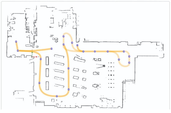 Therefore, by overlaying the tags on the map created by SLAM, as shown in Figure 14, it becomes possible to visualize the predefined routes of the AGVs within the same dynamically mapped environment created by the AMRs. This approach enables a centralized view of all robots in operation, regardless of the navigation technology used, facilitating the monitoring and supervision by the operator.