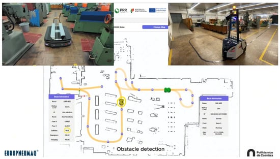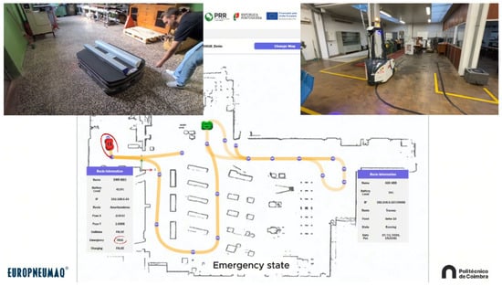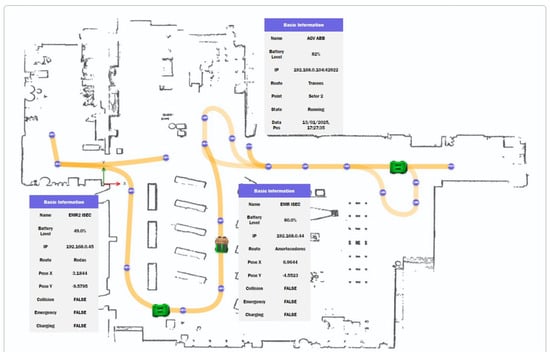 It is important to clarify that the fleet management system developed in the scope of this work operates primarily at the level of the centralized monitoring and supervision of AGVs and AMRs, based on the position, status, and task progress data collected through the APIs provided by each robot manufacturer. The low-level control—namely path planning, the SLAM execution, and collision or obstacle management—is handled internally by each robot via the manufacturer’s proprietary systems. The proposed system operates at a high level of abstraction, focusing exclusively on the monitoring of the location and operational status data from robots of different brands. This data is collected, translated, and standardized to be presented through a single, integrated interface, thereby facilitating supervision by human operators.