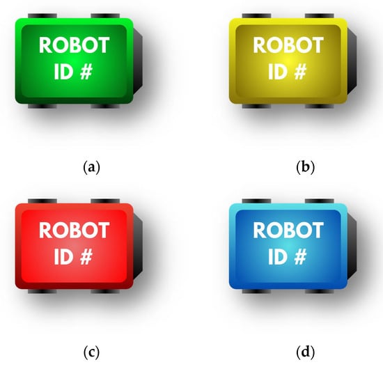 The color code corresponding to the navigation status of the robots: (a) green—the AGV is functioning correctly; (b) yellow—the AGV is stopped due to an obstacle; (c) red—the AGV is stopped due to a failure or malfunction; and (d) blue—the AGV is charging its batteries.