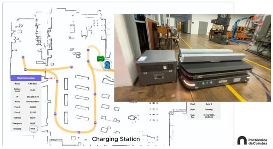 The fleet manager also allows for the real-time consultation (as Figure 19 demonstrates) of various data related to AGVs and AMRs, including the name, IP address, battery level, current route, and operational status. The current position of each mobile robot is also available for viewing. In AMRs, the X, and Y coordinates and orientation angle are displayed, while in AGVs, it is possible to view the tag on which it is located, and from there, consult the X and Y position of the respective tag.