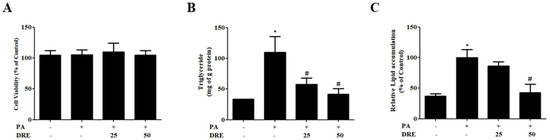 To evaluate the cytotoxicity of and lipid accumulation inhibition by DRE, AML12 cells were treated with PA in the presence or absence of DRE. Cell viability was not significantly affected by either DRE concentrations, indicating the safety of DRE under the tested experimental conditions (Figure 1A). PA significantly increased the intracellular TG levels compared to those in the control group (Figure 1B). However, co-treatment with DRE at 25 and 50 μg/mL significantly reduced TG accumulation in a dose-dependent manner. Oil red O staining revealed markedly increased lipid accumulation in the PA-treated cells, which was significantly attenuated by DRE (Figure 1C). This attenuation was more pronounced at high DRE concentrations (50 μg/mL).