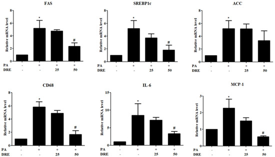 To investigate the effects of DRE on lipogenesis and inflammation following PA treatment, we assessed the expression levels of the related genes. PA significantly increased the expression levels of the lipogenesis-related genes, fatty acid synthase (FAS), sterol regulatory element-binding protein 1c (SREBP1c), and acetyl-CoA carboxylase (ACC). However, DRE decreased the FAS and SREBP1c levels. ACC levels were also decreased, but not significantly, by DRE. Similarly, levels of the inflammatory markers, cluster of differentiation 68 (CD68), interleukin-6 (IL-6), and monocyte chemoattractant protein-1, were significantly increased by PA but reduced by DRE (Figure 2).